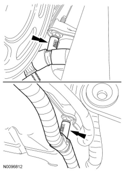 8. Drain the cooling system. For additional information, refer to Cooling System Draining, Filling and Bleeding in Cooling System &/or Engine Block Heater.