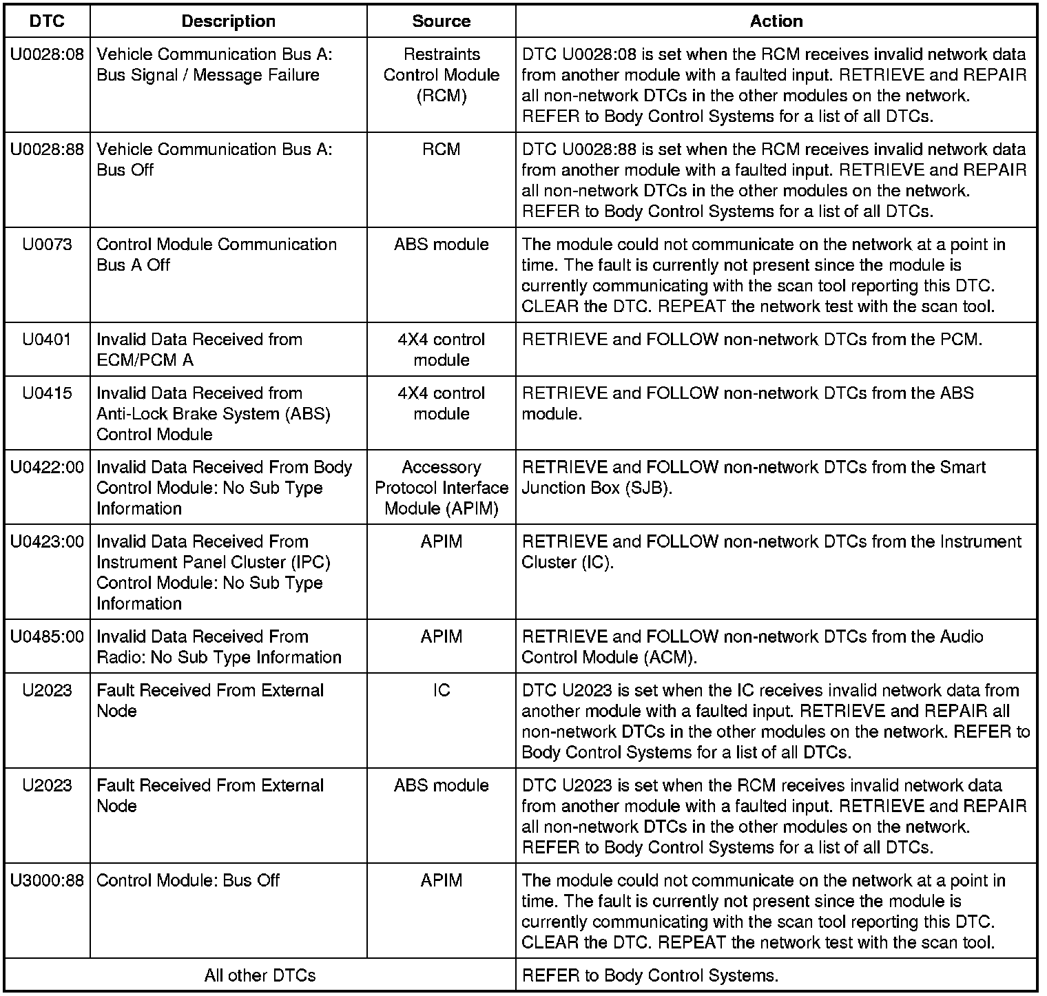 NOTE: Network DTCs (U-codes) are often a result of intermittent concerns such as damaged wiring or low battery voltage occurrences. Additionally, vehicle repair procedures such as module reprogramming often set network DTCs. Replacing a module to resolve a network DTC is unlikely to resolve the concern. To prevent repeat network DTC concerns, inspect all network wiring, especially connectors. Test the vehicle battery condition, refer to Battery.