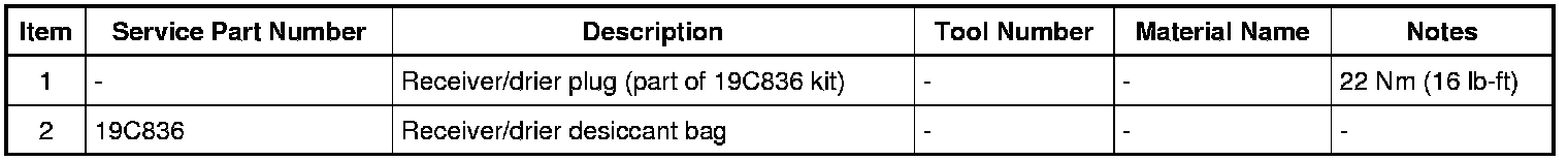 NOTE: Installation of a new receiver/drier desiccant bag is not required when repairing the A/C system, except when there is physical evidence of contamination from a failed A/C compressor or damage to the receiver/drier desiccant bag. Damage to the receiver/drier desiccant bag includes physical damage to the receiver/drier desiccant bag or moisture contamination. Moisture contamination results only from a complete loss of refrigerant and equalization of the refrigerant system pressure with atmospheric pressure for a period longer than one hour. If even a slight amount of positive refrigerant pressure is present in the system before repairs are carried out, the receiver/drier desiccant bag should not be replaced.