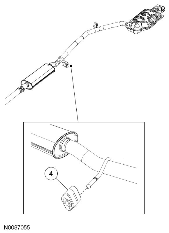 Support the exhaust system with a suitable jackstand. Using soapy water, disconnect the 2 muffler and tail pipe isolators and lower the exhaust approximately 50.8 mm (2 in).