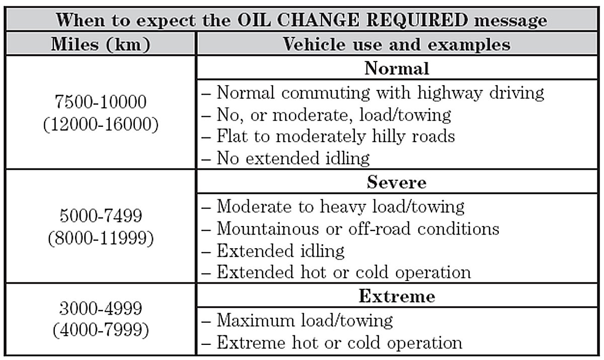Your vehicle is equipped with an Intelligent Oil Life Monitor that determines when the engine oil should be changed based on how your vehicle is used. By using several important factors in its calculations, the monitor helps reduce the cost of owning your vehicle and reduce environmental waste at the same time. This means you won't have to remember to change the oil on a mileage-based schedule; the vehicle lets you know when an oil change is due by displaying ENGINE OIL CHANGE DUE or OIL CHANGE REQUIRED in the message center. The following table is intended to provide examples of vehicle use and its impact on engine oil change intervals; it is provided as a guideline only. Actual engine oil change intervals will depend on several factors and will generally decrease with severity of use.