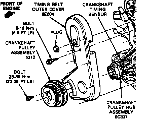 8. Install the crankshaft pulley assembly. Tighten four attaching bolts to 20-28 lbs. ft. (28-38 Nm).