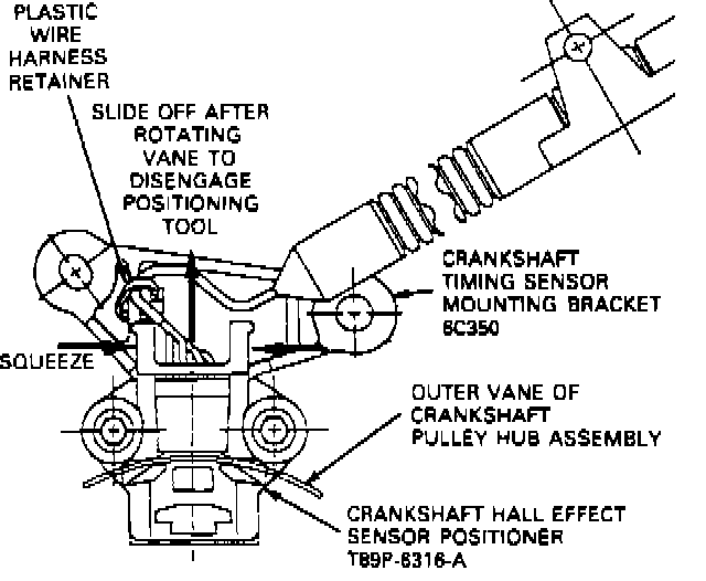 4. Rotate the crankshaft so that the outer vane on the crankshaft pulley hub engages both sides of the crankshaft Hall effect sensor positioner (Ford T89P-6316-A, or equivalent). Tighten sensor retaining bolts to 22-31 lbs. in. (2.5-3.5 Nm).