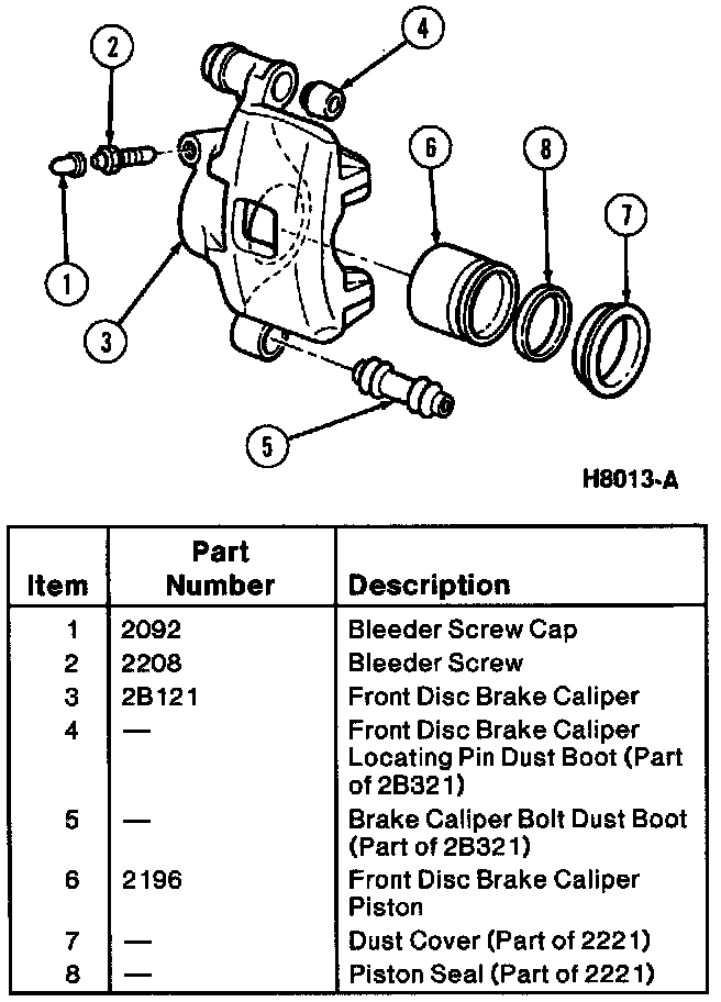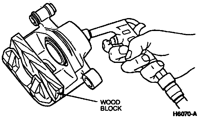 WARNING: do not use an excessive amount of air pressure to remove the front disc brake caliper piston. Excessive pressure can force the front disc brake caliper piston out the front disc brake caliper bore with enough force to cause personal injury. Never attempt to catch the front disc brake caliper piston by hand as it comes out of its bore.