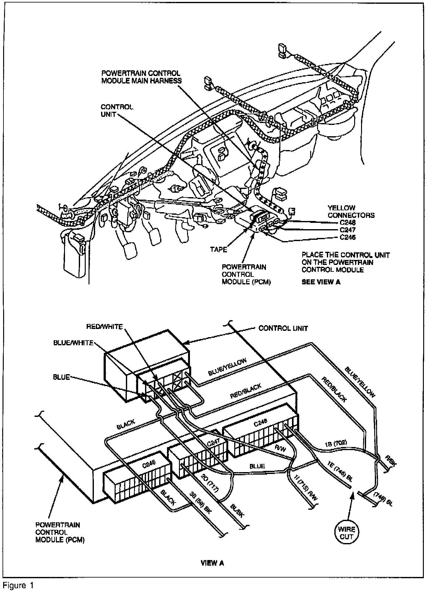 ^ Connect the control unit wire (blue/white) with the PCM wire (blue/black) using the solder/splice procedure (Figure 2).
