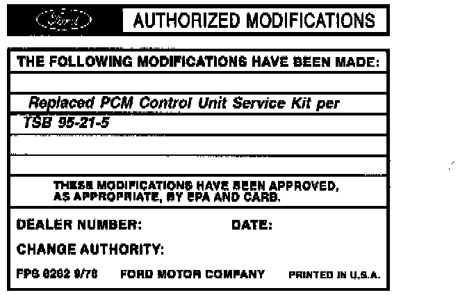 Obtain an Authorized Modifications Decal and list the date, dealer number, and summary of modifications performed. Select a prominent place adjacent to the Vehicle Emission Control Information Decal suitable for installing the Authorized Modifications Decal. Clean the area, install the decal, and cover it with a clear plastic decal shield.
