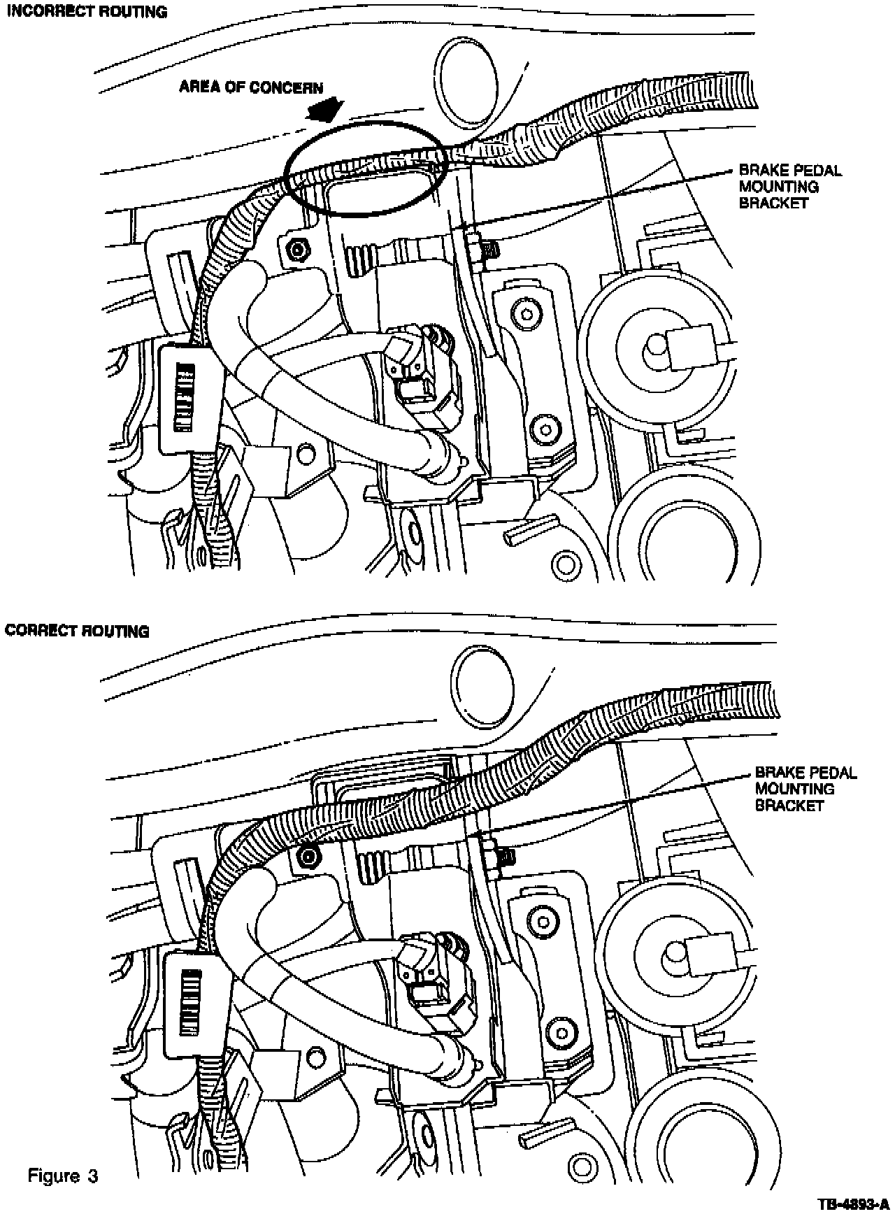 ^ Using a flashlight, inspect air bag wire harness routing along brake pedal mounting bracket (Figure 3).