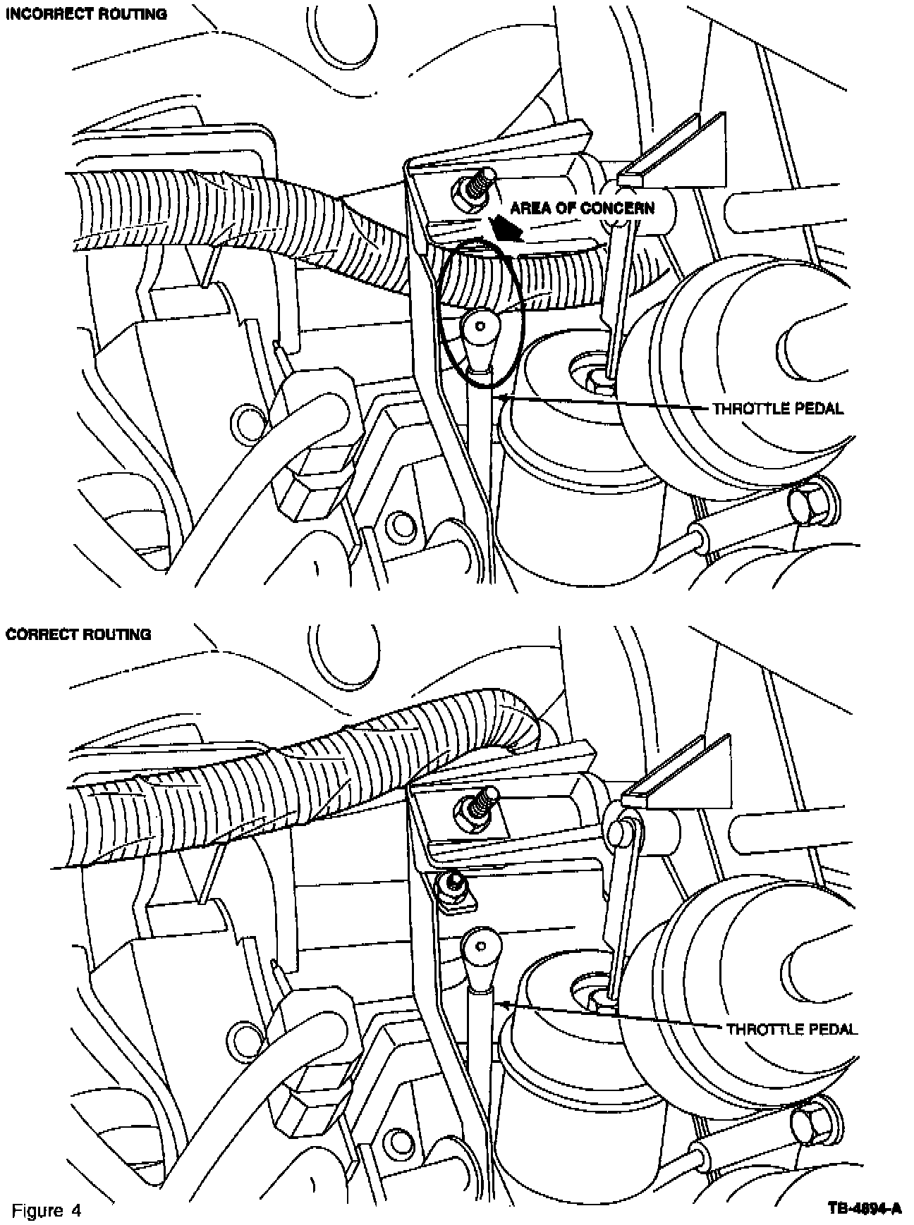 ^ Wires may be chafed or cut above the throttle pedal (Figure 4).