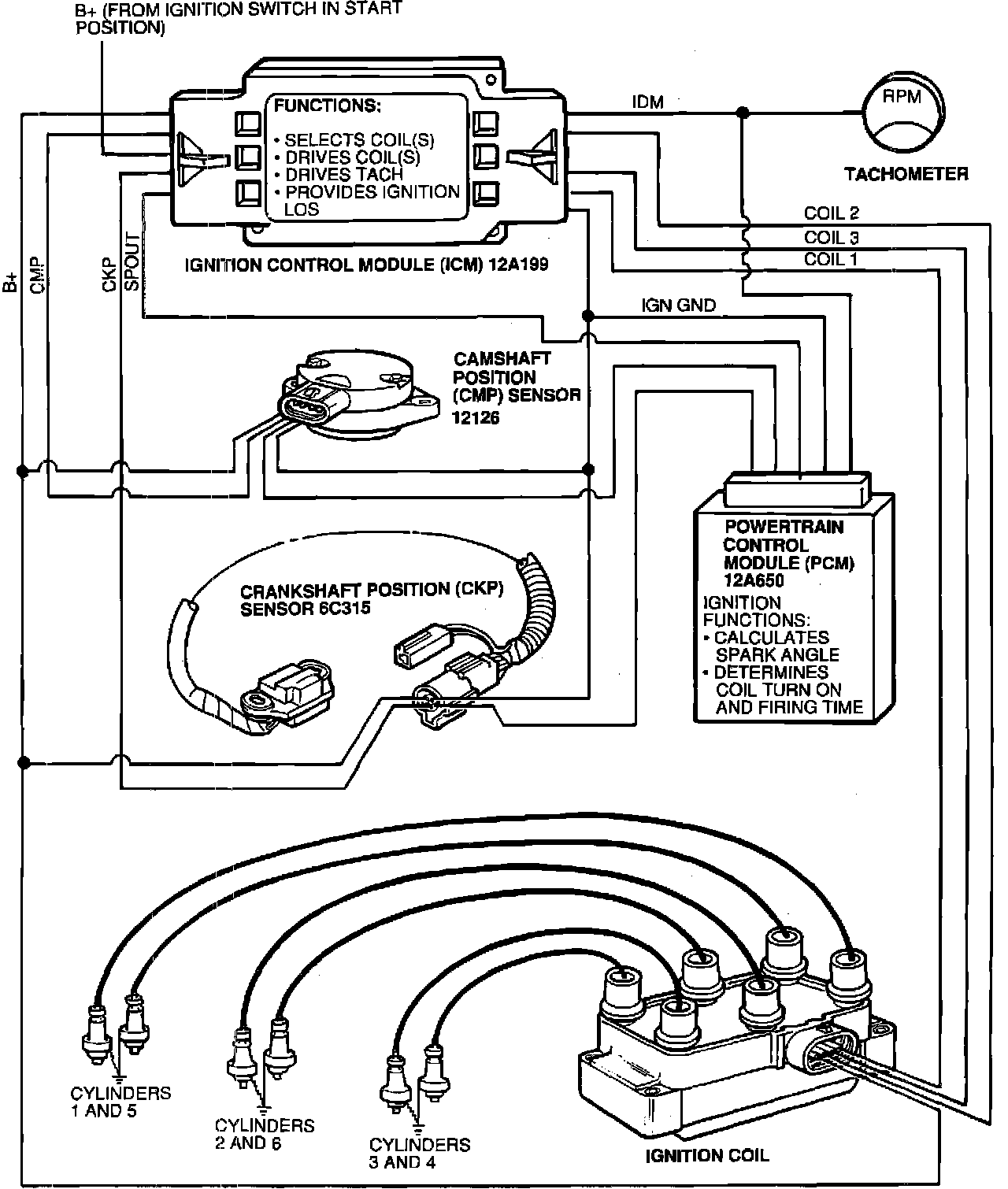 The Ignition Diagnostic Monitor (IDM) is an output from the EI module that provides diagnostic information concerning the ignition system to the Powertrain Control Module (PCM) for self-test and is also the input signal for the vehicle tachometer. If the CMP circuit fails and an attempt to start the engine is made, the ICM will randomly select one of the three coils to fire. If hard starting results, turning the key off and then cranking again will result in another guess. Several attempts may be needed until the proper coil is selected allowing the vehicle to be started and driven until repairs can be made. The Failure Mode Effects Management (FMEM) system attempts to keep the vehicle driveable in spite of certain PCM failures that prevent the processor from providing spark angle or dwell commands. The PCM opens the SPOUT line and the ICM fires the coils directly from the PIP input. This results in a fixed spark angle of 10° and a fixed dwell.
