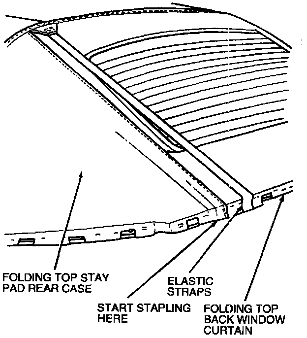NOTE: The folding top stay pad rear case generally will not be removed to replace the back window glass. If it is removed, it will be stapled before the back window glass is installed.