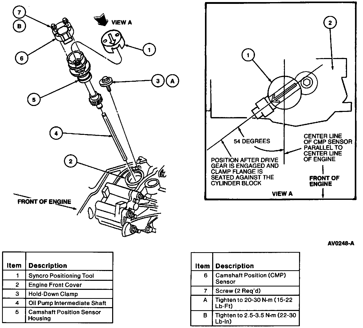 CAUTION: Special service tool Syncro Positioning Tool T96T-12200-A must be obtained prior to installation of the camshaft position sensor. Failure to follow this procedure will result in improper camshaft position sensor alignment. This will result in the fuel system being out of time with the engine, possibly causing engine damage.