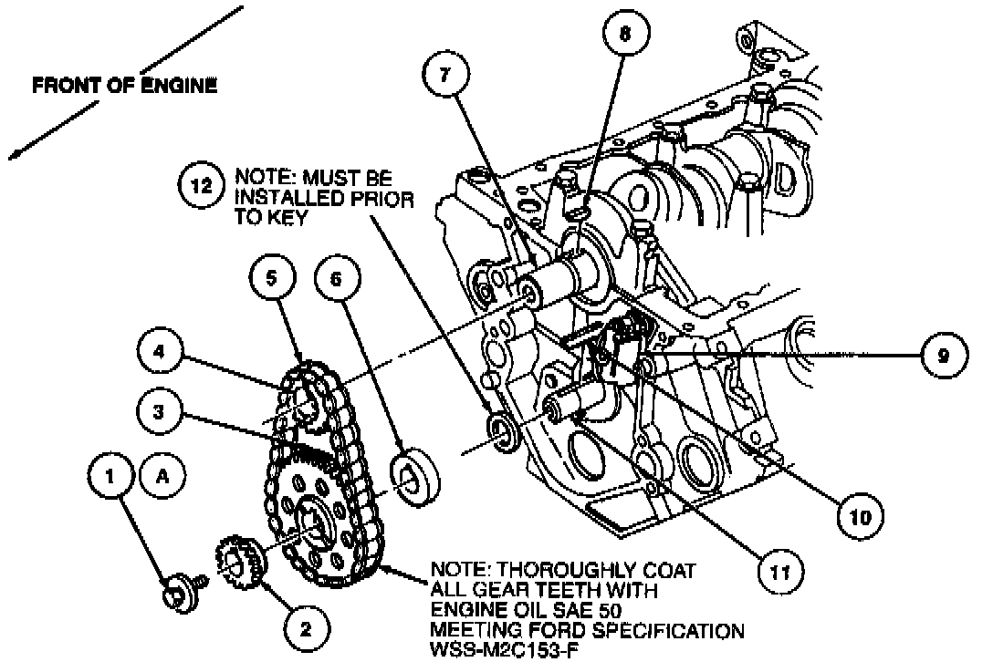 3. Lubricate timing chain with Super Premium SAE 5W30 Motor Oil XO-5W30-QSP or equivalent meeting Ford specification WSS-M2C153-G.