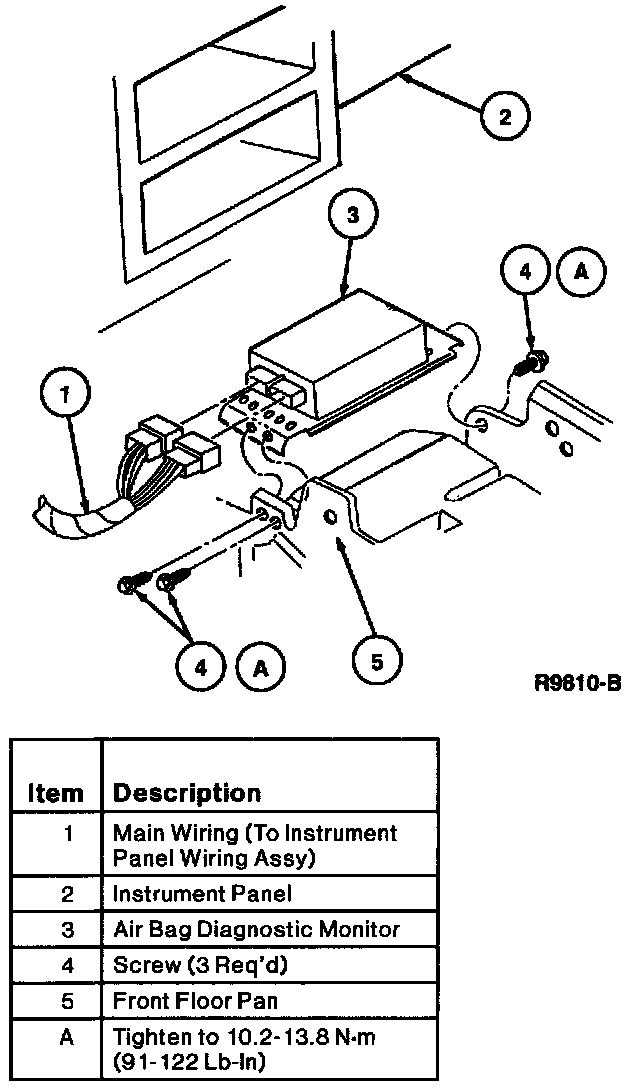 1. Position air bag diagnostic monitor and bracket on instrument panel and install retaining screws. Tighten to 10.2-13.8 N.m (90-122 Lb-In).