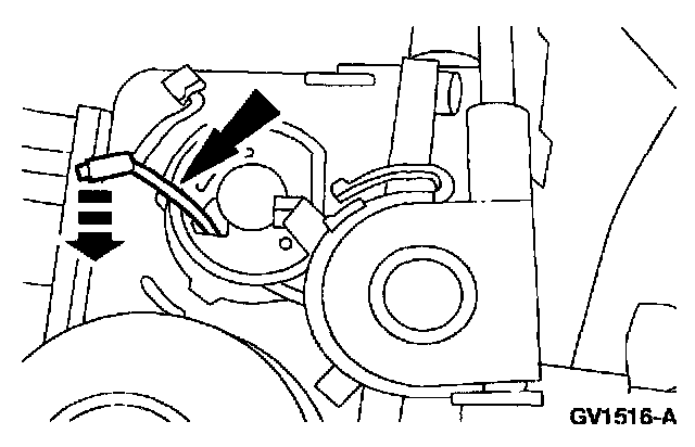 ^ Move the spring tab away from the speed control cable end to release the cable from the actuator. Remove the speed control actuator cable.