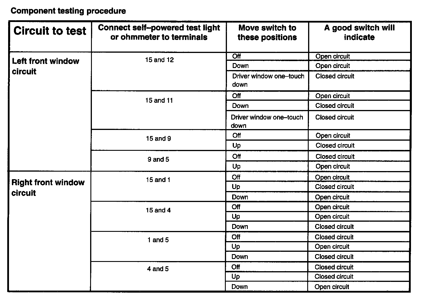 The component connector MUST BE REMOVED before testing. To test a single circuit within the component, select that circuit under the column TO TEST. If you wish to test the complete component, perform all tests.