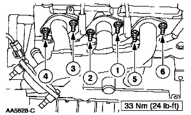 Install the upper intake manifold. Tighten the bolts in the sequence shown in two stages: