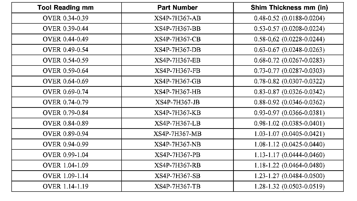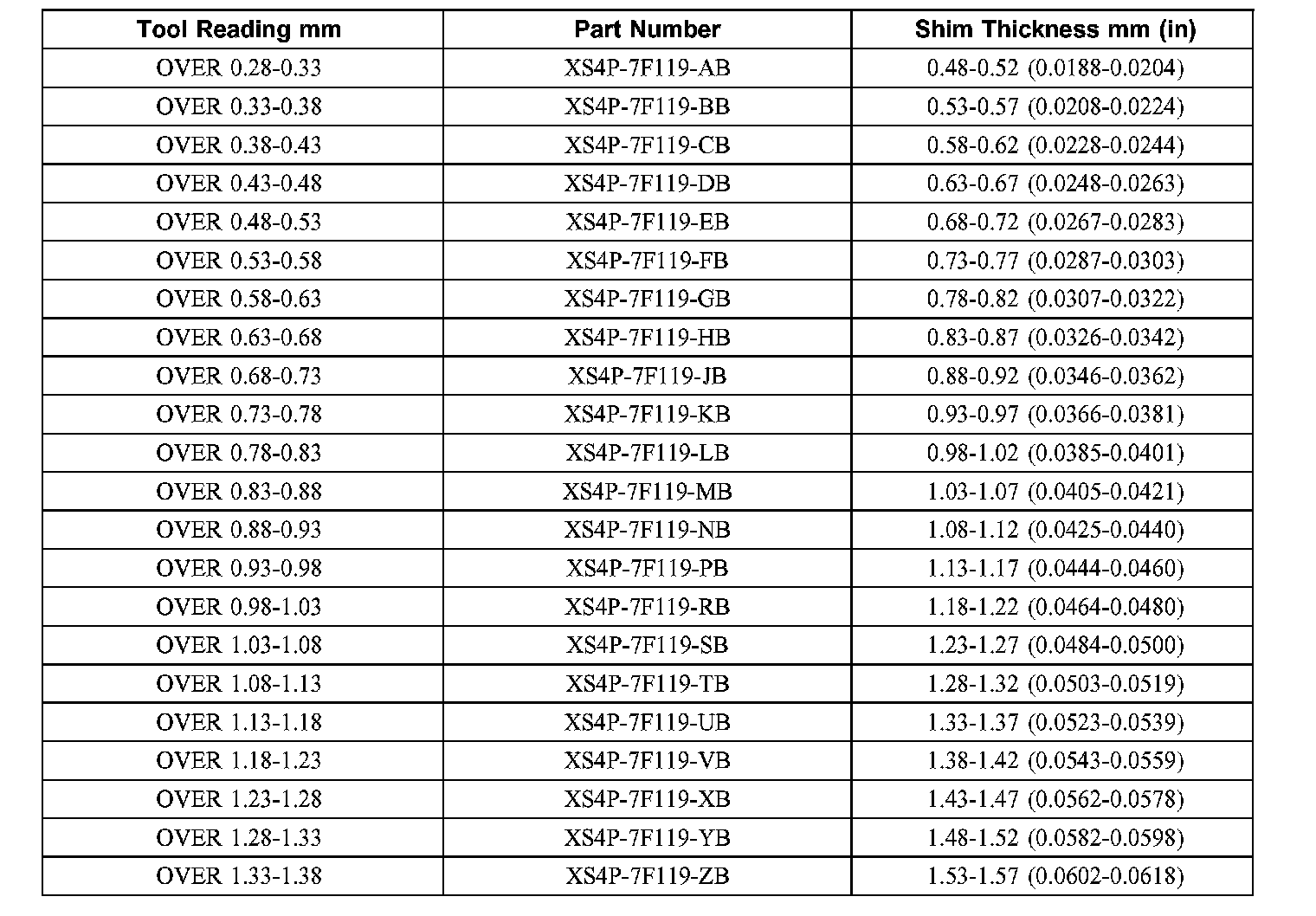 Transfer Shaft Shim Selection Chart