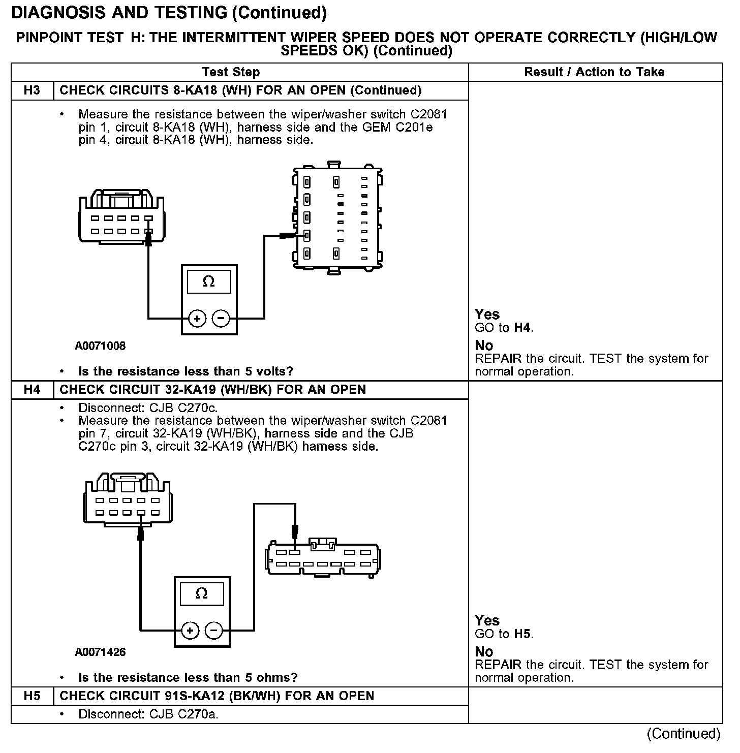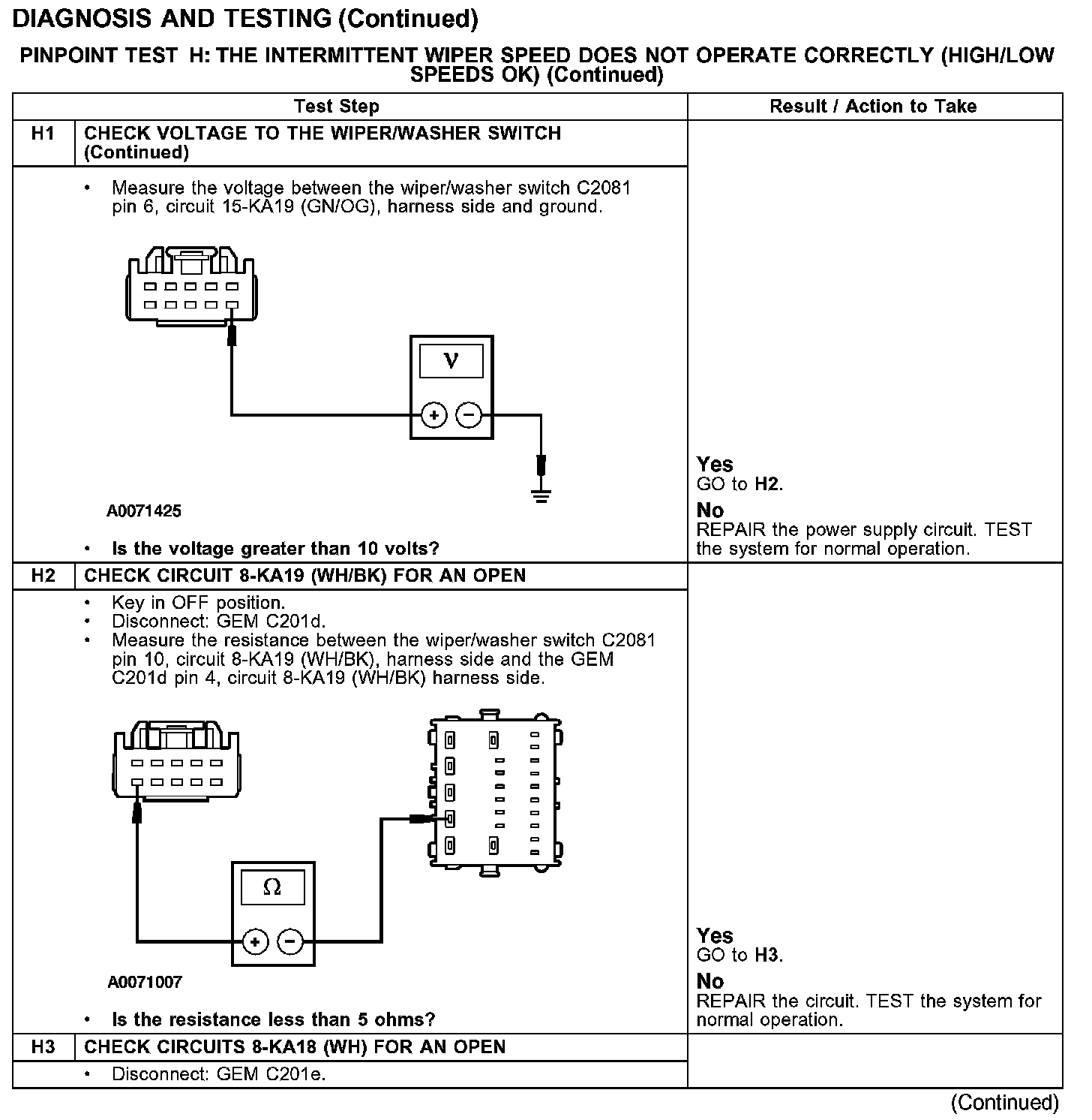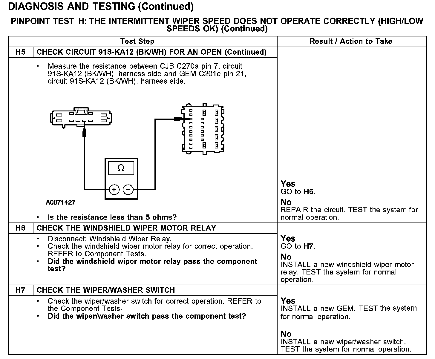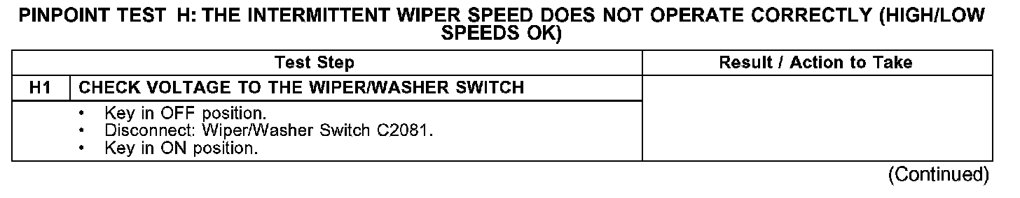 PINPOINT TEST H: THE INTERMITTENT WIPER SPEED DOES NOT OPERATE CORRECTLY (HIGH/LOW SPEEDS OK)