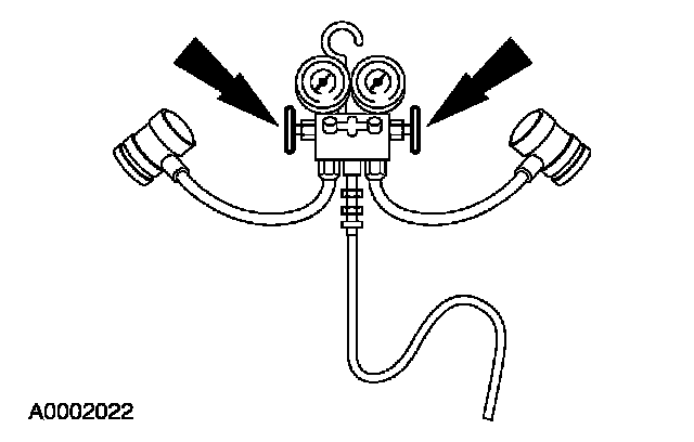 1. Turn both valves on the R-134a Manifold Gauge Set clockwise to close the low- and high-pressure hoses to the center manifold and center hose.