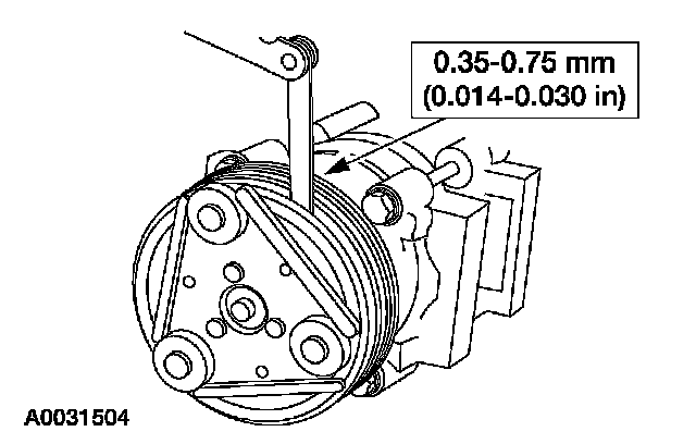 2. Remove the A/C clutch. Add or remove spacers between the A/C clutch and the compressor shaft until clearance is within specification.