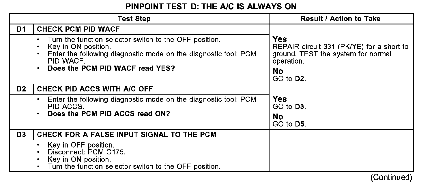 PINPOINT TEST D: THE A/C IS ALWAYS ON