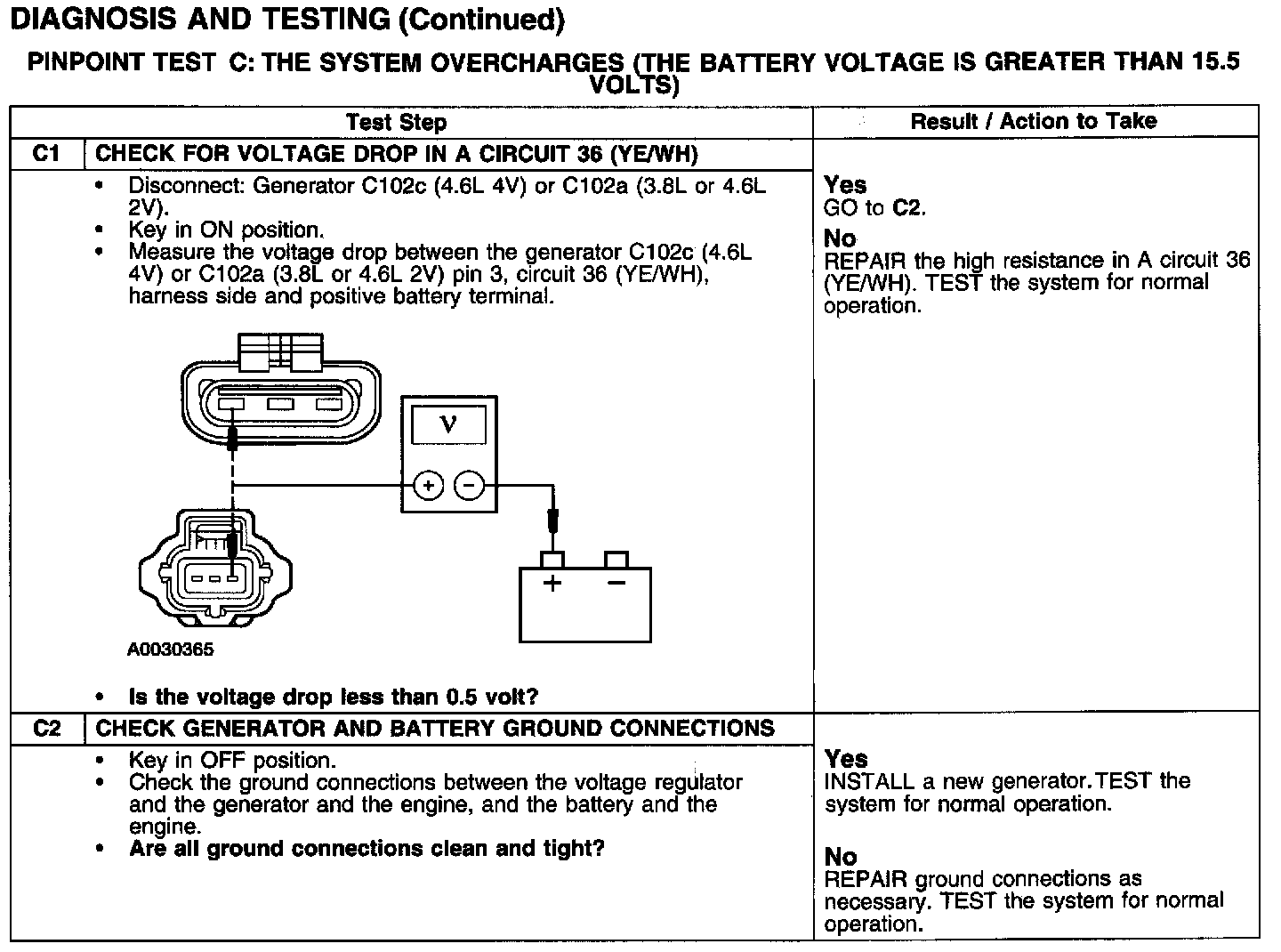 PINPOINT TEST C: THE SYSTEM OVERCHARGES (THE BATTERY VOLTAGE IS GREATER THAN 15.5 VOLTS)