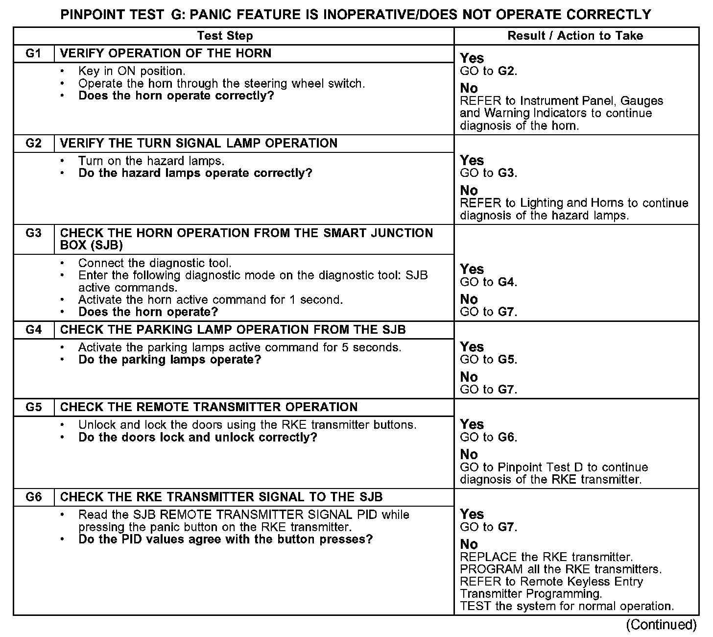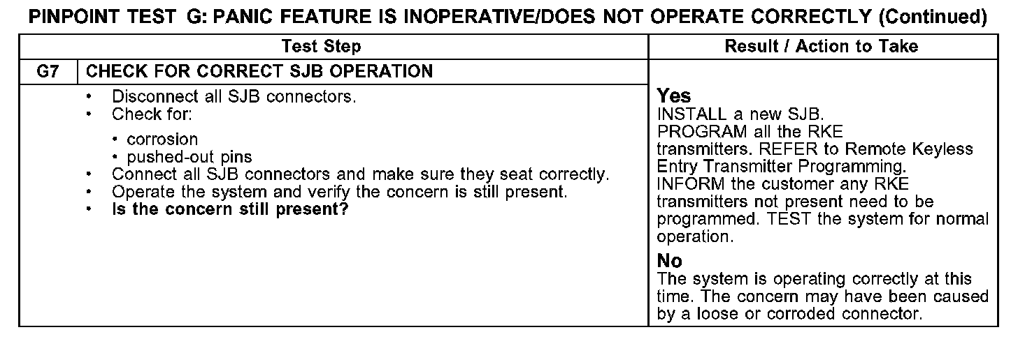 PINPOINT TEST G: PANIC FEATURE IS INOPERATIVE/DOES NOT OPERATE CORRECTLYG1-G6: