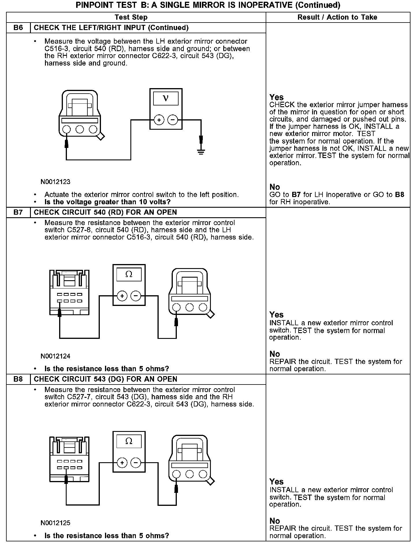 The exterior mirror control switch is supplied voltage from circuit 956 (OG/LG) and grounded through circuit 1205 (BK). The exterior mirror control switch activates the LH exterior mirror by switching voltage and ground to circuits 541 (DB), 540 (RD) and 542 (YE). The switch activates the RH exterior mirror by switching voltage and ground to circuits 544 (VT), 543 (DG), and 542 (YE). The exterior mirror control switch must be in the appropriate (left or right) position for the desired mirror to operate.