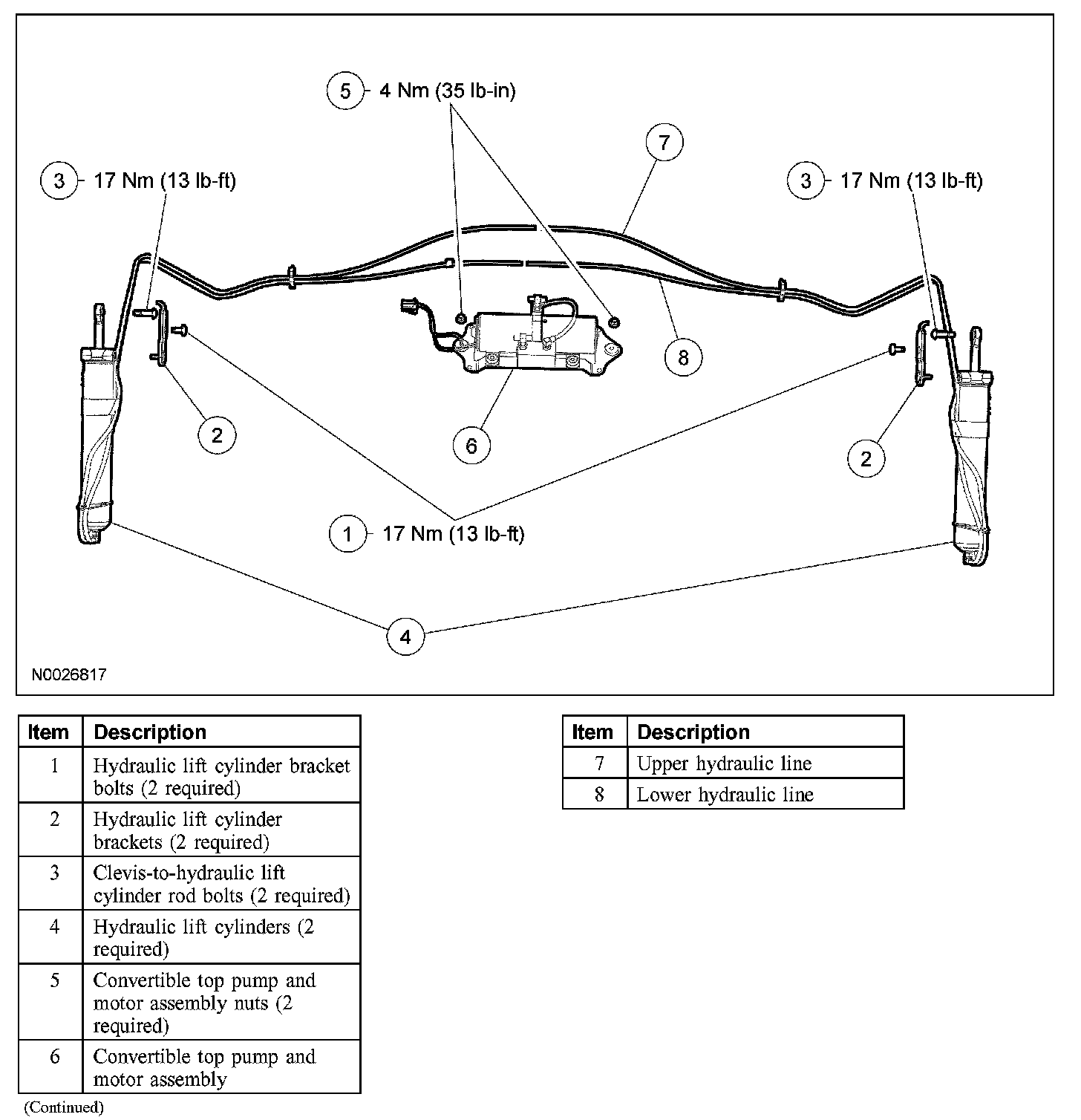 NOTE: The convertible top hydraulic components are removed from the vehicle as an assembly. The hydraulic components are individually repaired and the system must be bled before being installed into the vehicle.