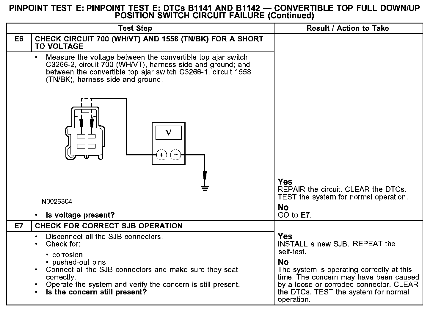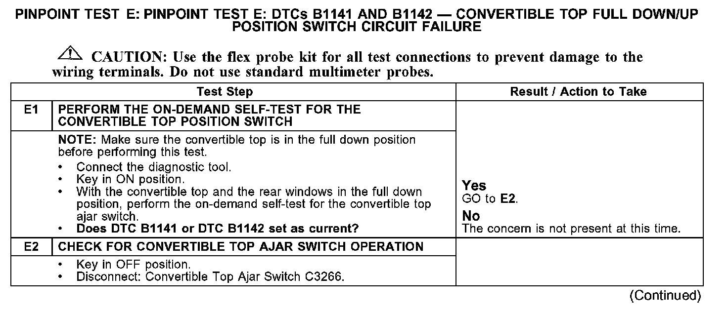 Test E: DTCs B1141 and B1142 - Convertible Top Full Down/Up Position Switch Circuit Failure