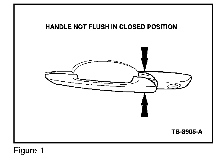 Some 2005-2008 Mustang vehicles may exhibit an exterior door handle not flush in the closed position. This may result in a loose handle, rattle noise, hard to open, and/or door self locks when opening outside handle. (Figure 1)