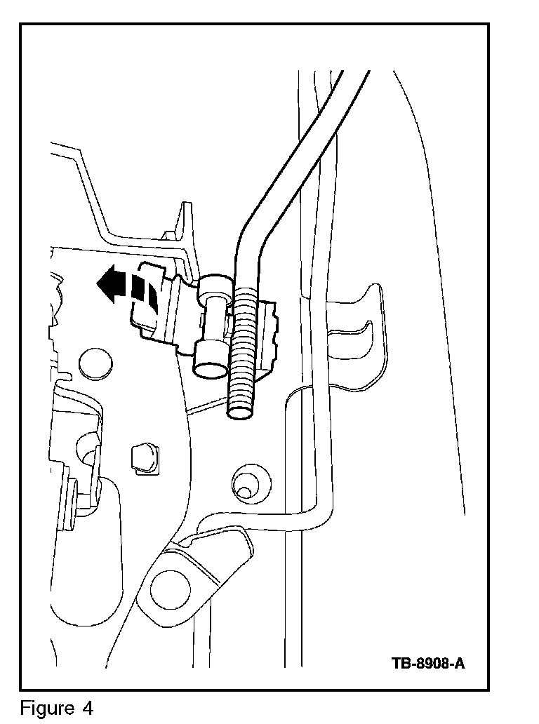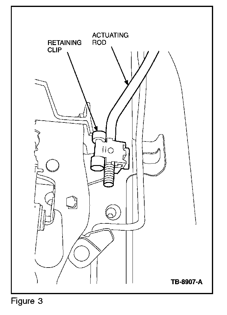 5. Disconnect the exterior door handle actuating rod from the front door latch assembly.