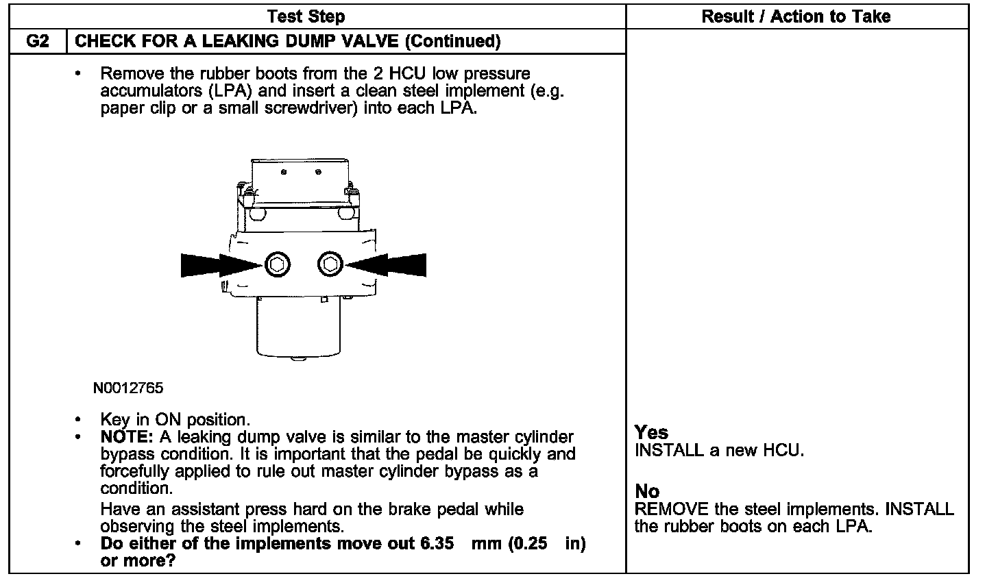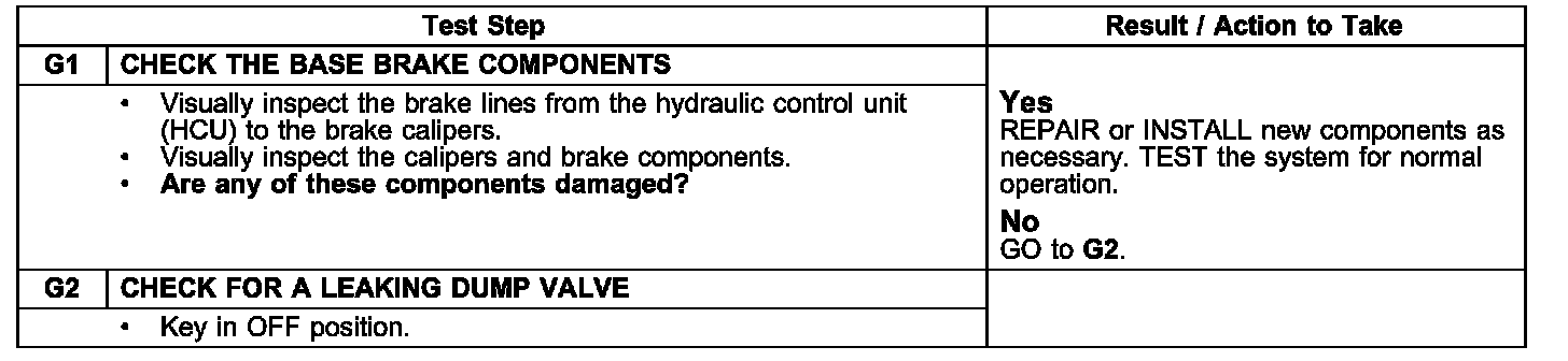 Pinpoint Test G: Spongy/Soft/Low Brake Pedal with No Warning IndicatorTest G1-G2: