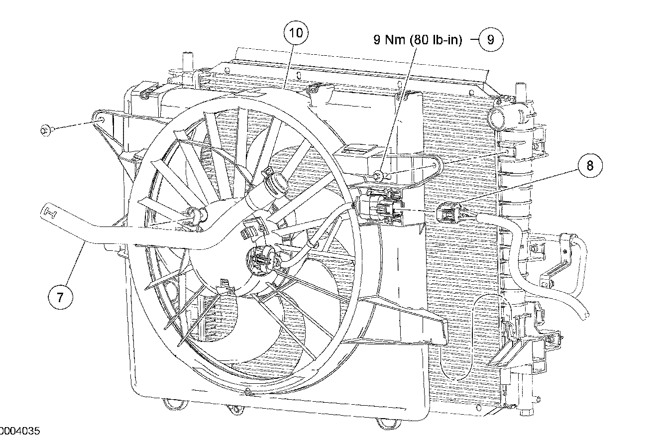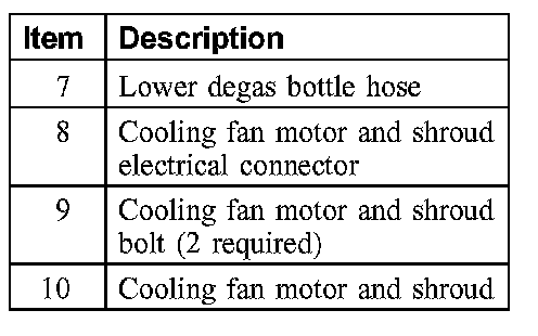 7. Remove the 2 bolts and the cooling fan motor and shroud.