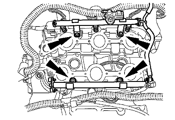 16. Position the fuel rail and injectors and install the 4 bolts.