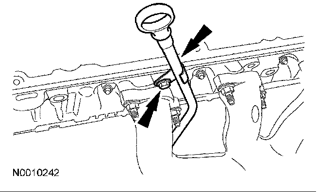 CAUTION: During engine repair procedures, cleanliness is extremely important. Any foreign material, including any material created while cleaning gasket surfaces that enters the oil passages, coolant passages or the oil pan, can cause engine failure.