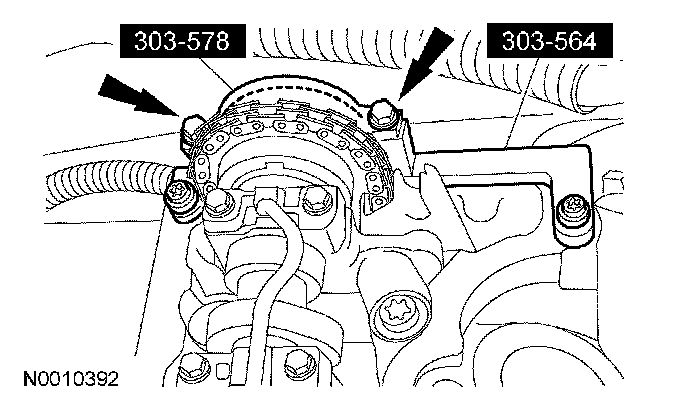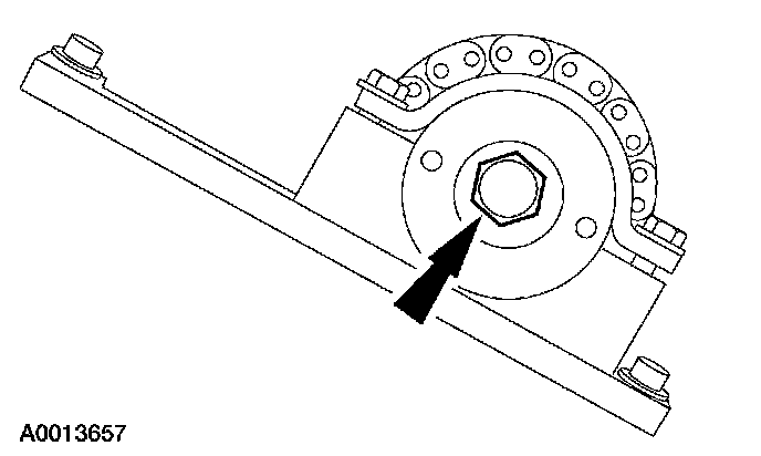 30. Using the special tool with the Camshaft Sprocket Nut Socket 303565, remove the RH camshaft bolt.