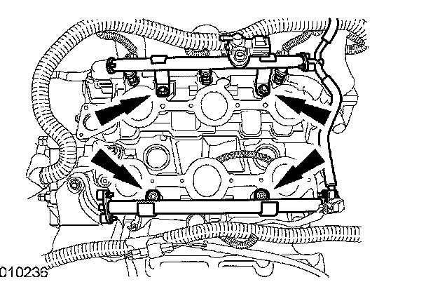 25. Remove the 4 bolts and then remove the fuel rail and injectors.