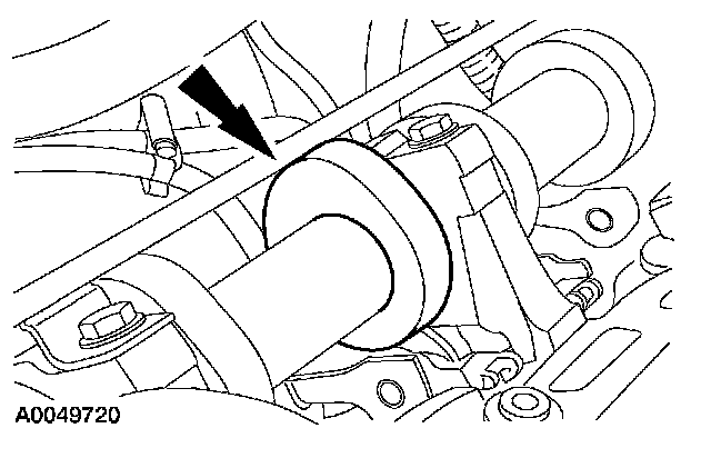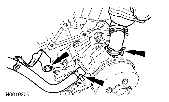 27. Remove the bolt and then disconnect the coolant bypass hose and the heater hose from the coolant pump.