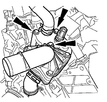 28. Remove the 3 bolts and then remove the thermostat housing, hoses and coolant tube.