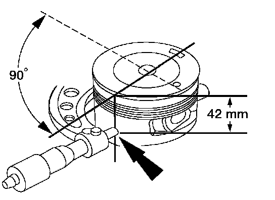 1. Measure the piston diameter 90 degrees from the piston pin and 42 mm down from the top of the piston at the point indicated.