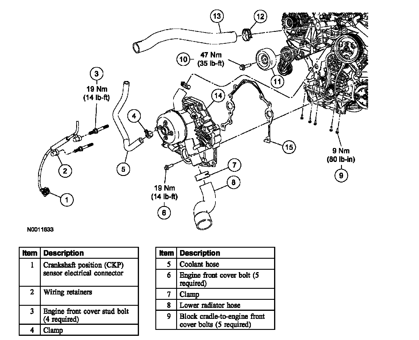 11. Disconnect the coolant bypass hose from the coolant pump and remove the engine front cover.