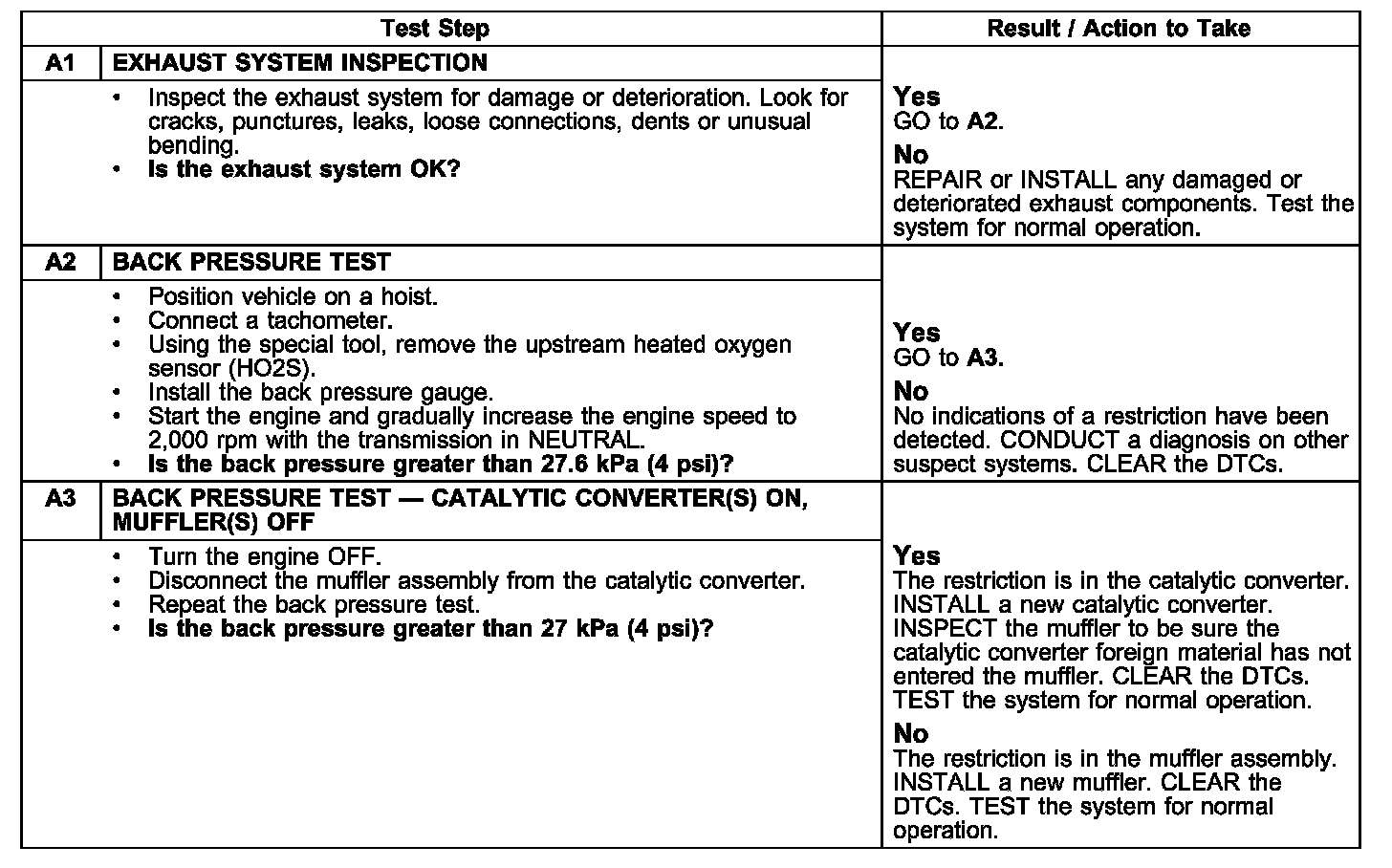 PINPOINT TEST A: RESTRICTED EXHAUST SYSTEM TESTTest A1-A3: