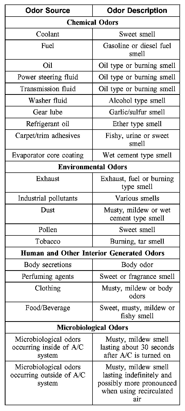 1. Identify the type of odor present in the vehicle. Do not proceed with A/C odor treatment if the odor source is found to be outside of the A/C system. Refer to the chart for examples.