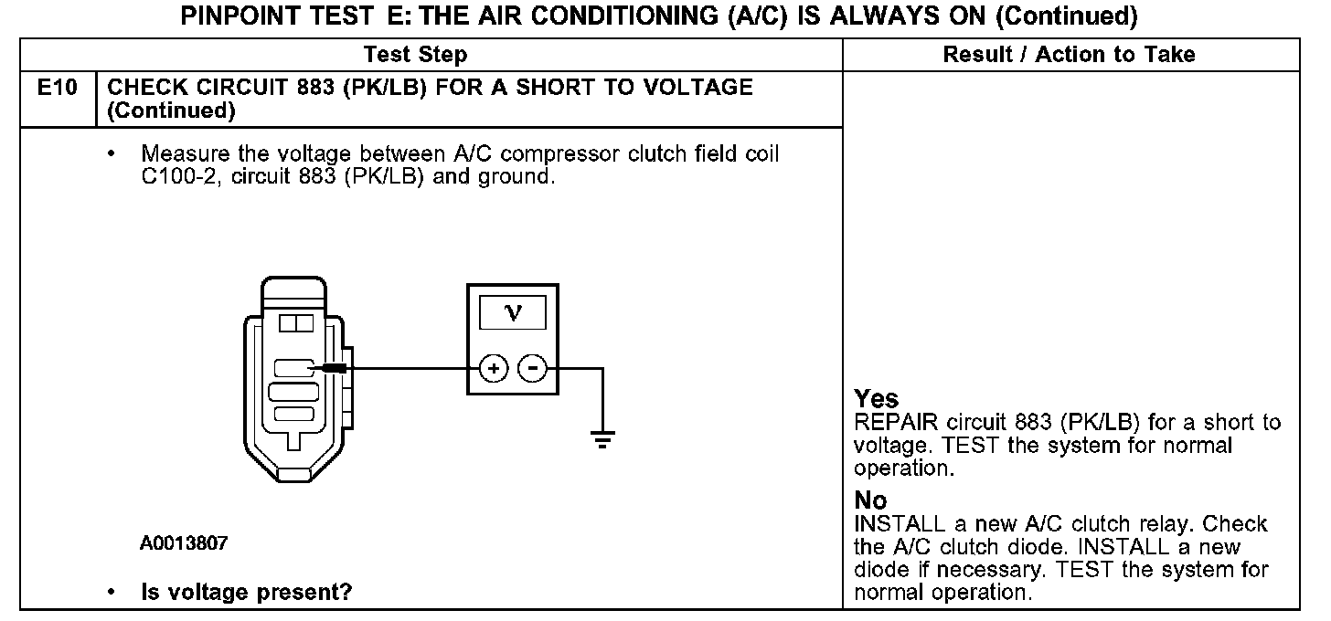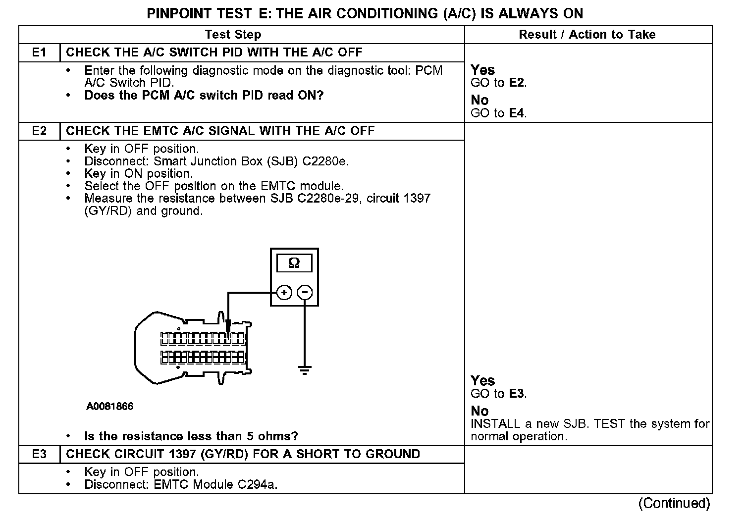 PINPOINT TEST E: THE AIR CONDITIONING (A/C) IS ALWAYS ONE1-E3: