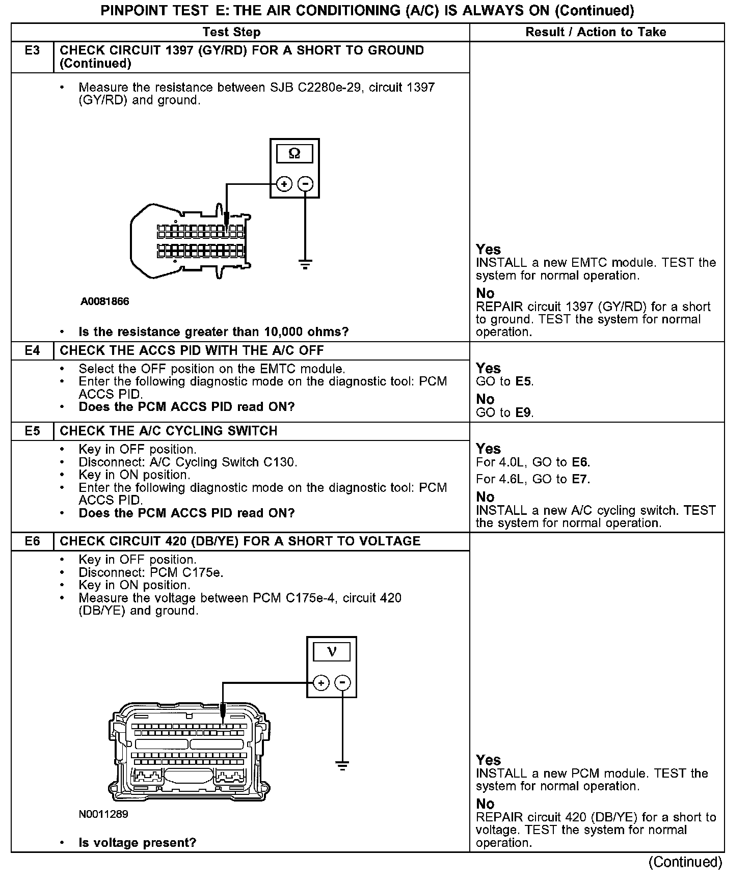Under normal operation, when A/C is requested, a ground signal is sent to the smart junction box (SJB) through circuit 1397 (GY/RD) then a message is sent from the SJB through the CAN bus to the PCM. Voltage is provided to the A/C cycling switch through circuit 391 (RD/YE). The PCM receives input from the A/C cycling switch through circuit 420 (DB/YE) and (4.6L only) through the dual function pressure switch to circuit 198 (DG/OG).