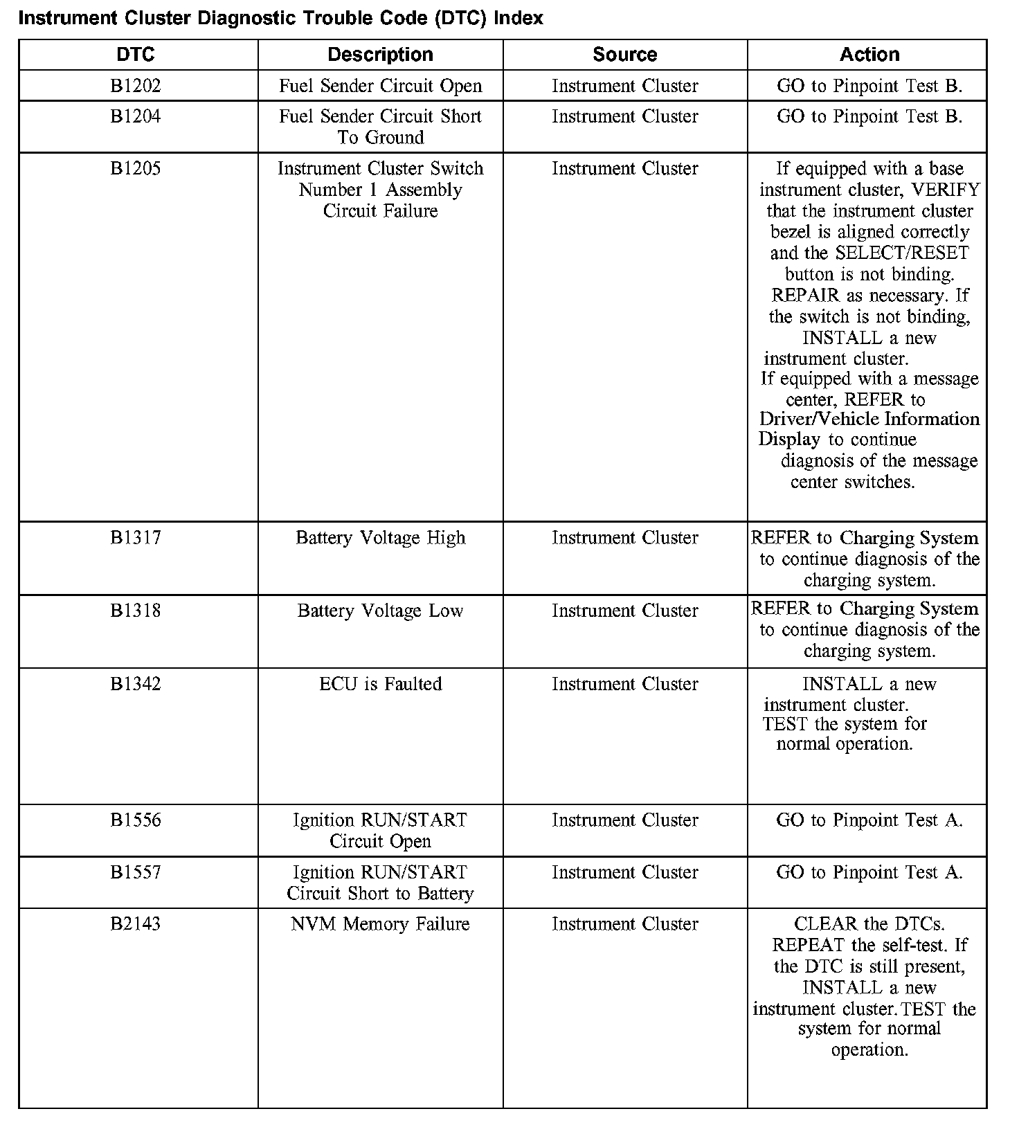 Instrument Cluster Diagnostic Trouble Code (DTC) Index