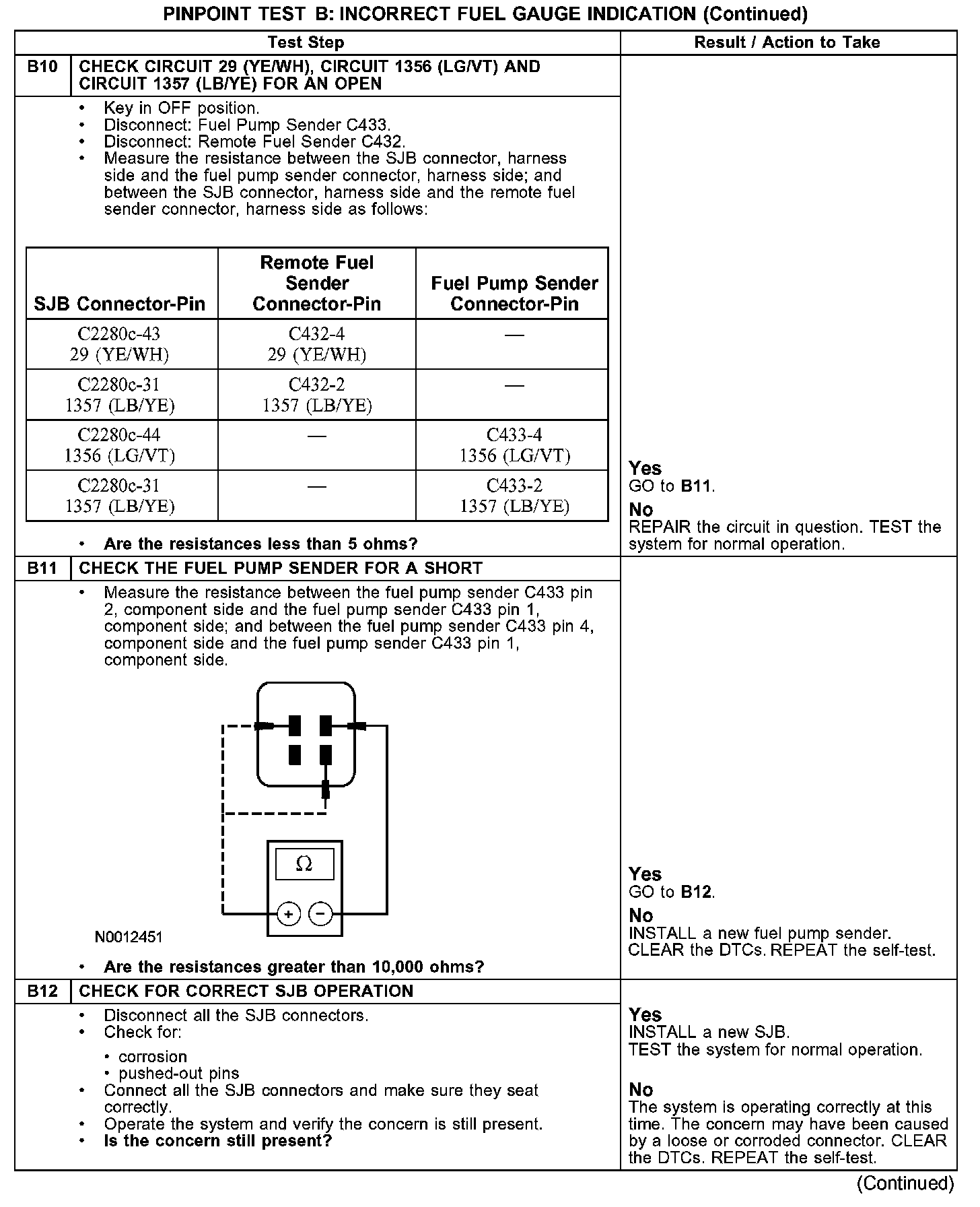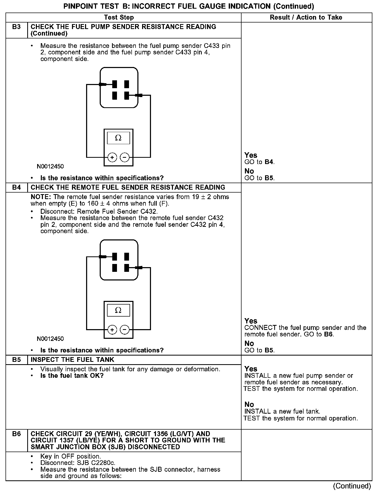 The fuel tank is a saddle tank design with variable resistance senders, driven by floats, that provide resistances related to fuel height, to the smart junction box (SJB). The fuel level is determined using a variable resistance fuel sender unit, with an approximate resistance range between 15 ohms at empty (E) and 160 ohms at full (F) ± 1%. The fuel pump sender is hardwired to the SJB through the signal circuit 1356 (LG/VT) and the return circuit 1357 (LB/YE). The remote fuel sender is hardwired to the SJB through the signal circuit 29 (YE/WH) and the return circuit 1357 (LB/YE). The SJB monitors the resistance readings that are sent to the SJB from the fuel senders and sends the instrument cluster a message over the communication network to command the fuel gauge with a corresponding movement of the pointer. If the remote fuel sender is open, the fuel gauge defaults to the fuel delivery module sender value only and the fuel gauge indicates E to 1/2 tank. If the fuel pump sender is open, the fuel gauge defaults to the empty position.