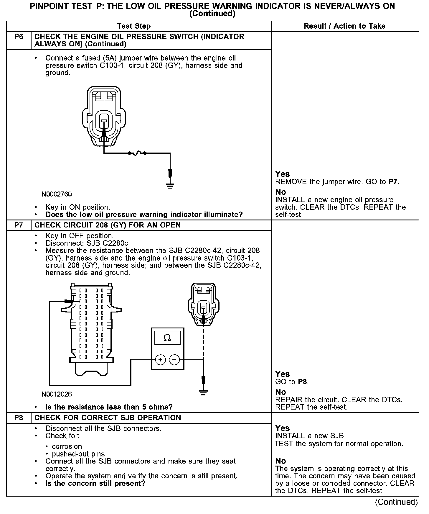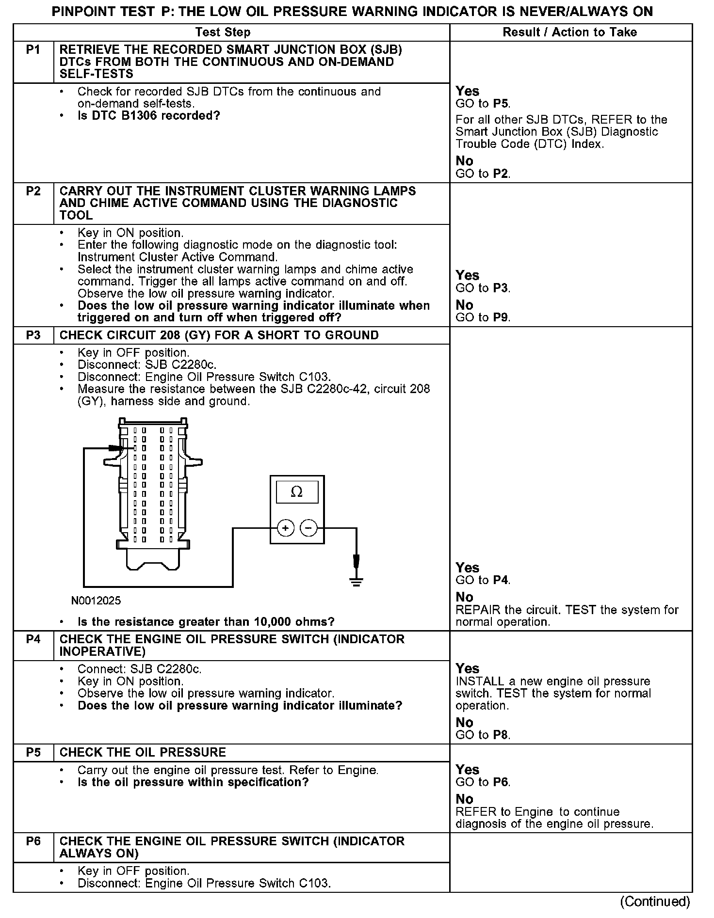 PINPOINT TEST P: THE LOW OIL PRESSURE WARNING INDICATOR IS NEVER/ALWAYS ONP1-P6: