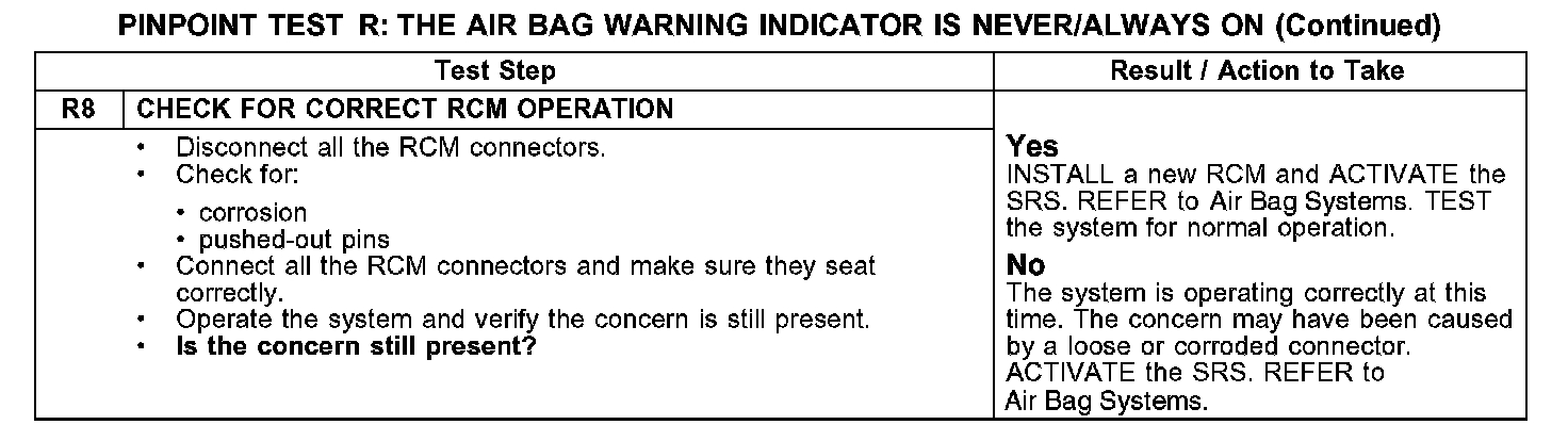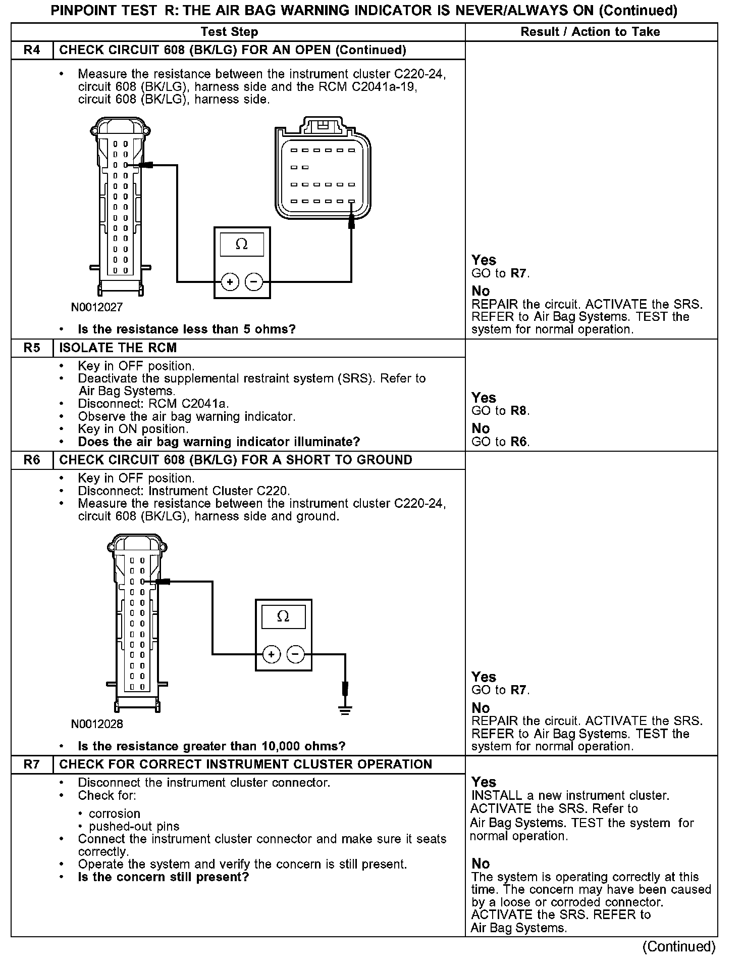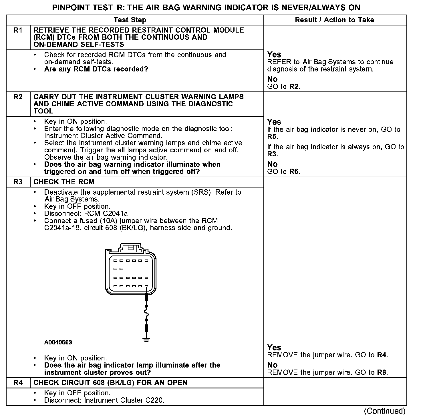 PINPOINT TEST R: THE AIR BAG WARNING INDICATOR IS NEVER/ALWAYS ONR1-R4: